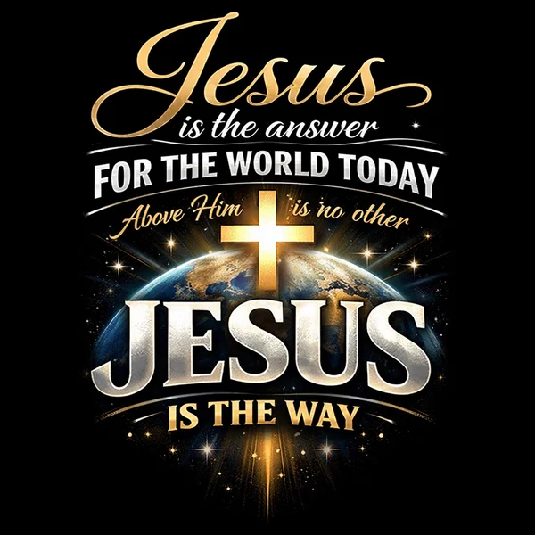 This powerful, thought-provoking design presents a symbolic image of the world and the path of direction, centered on a depiction of Jesus in radiant gold against a deep black background. The contrast between light and dark highlights the message of guidance, truth, and divine direction in today’s world.