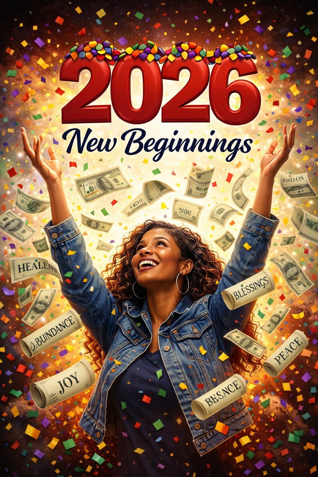 From above, blessings begin to pour downβ€”symbolized by flowing abundance and golden scrolls gently falling around her. Each scroll carries a promise: Joy. Abundance. Healing. Hallelujah. Blessing. Peace. Obedience. These are not just wordsβ€”they are declarations over her life, reminders that this new beginning is filled with purpose, restoration, and overflow