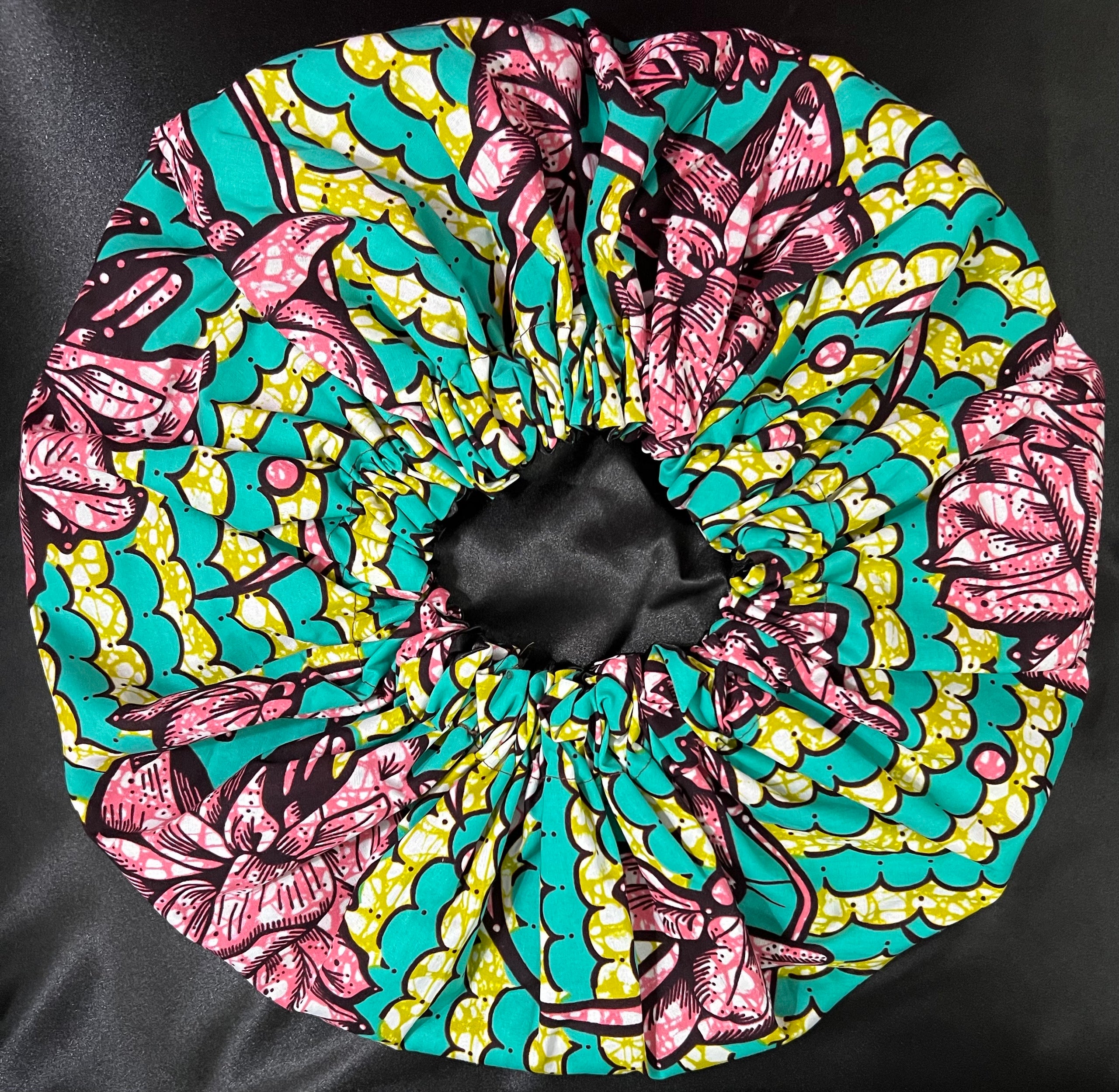 Large “African Print” Bonnet 100% Cotton exterior and satin inside.